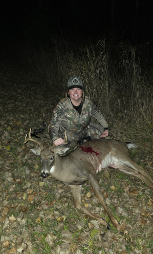 Whitney Rollins from AuGres bagged an 8 point in Arenac County! Being 8 months pregnant, I didn't think I would get out much. 10/28, I decided to go out, and within 30 minutes this eight point came out. I immediately put my camera on him and got m bow ready. Double lung shot and found him within 100 yards.
